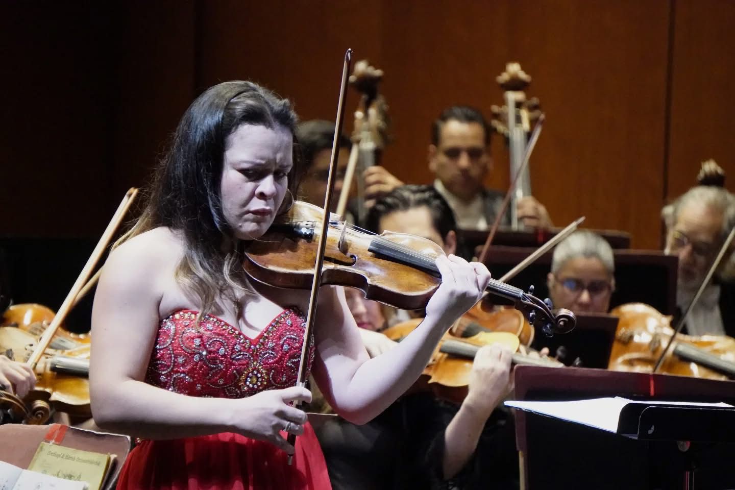 La presentación se realizó en el Teatro Juárez, bajo la dirección artística del maestro Juan Carlos Lomónaco, con la participación especial de la violinista Angélica Olivo, solista con amplia trayectoria internacional, reconocida por su versatilidad interpretativa y su presencia junto a diversas orquestas.